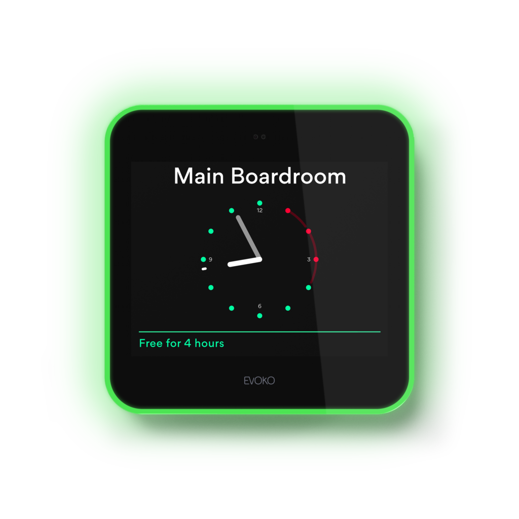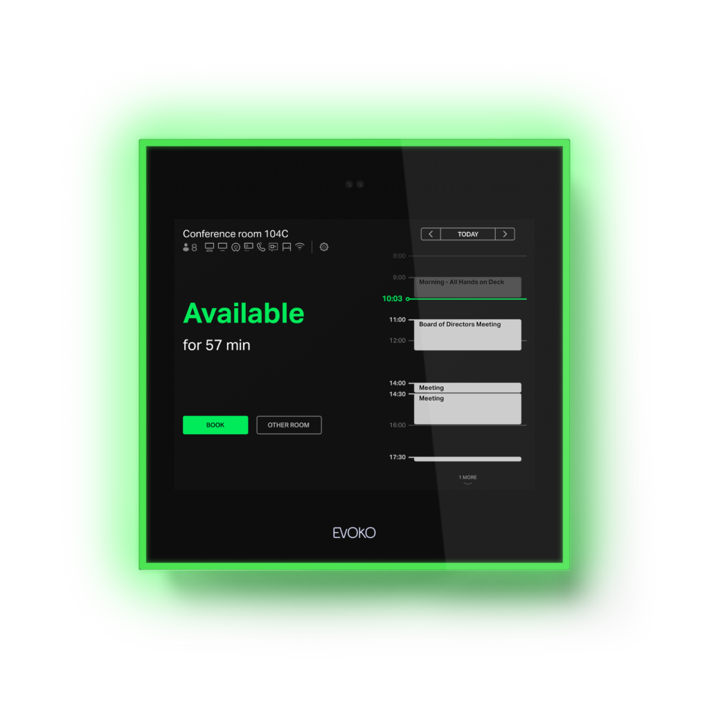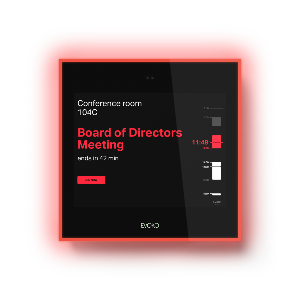 O Evoko Naso Room Manager é um dispositivo instalado na porta da sala que permite visualizar e gerenciar reservas em tempo real. Principais benefícios: